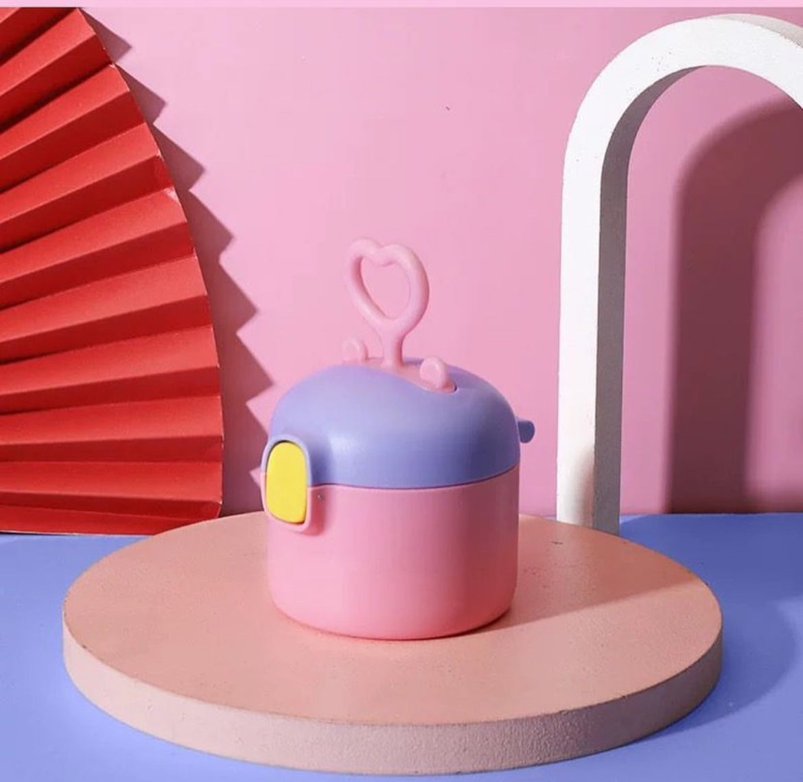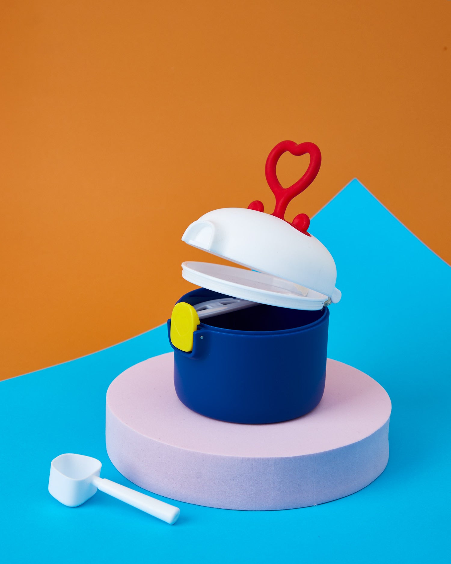 Almacenador de leche en polvo con cuchara dosificadora y cierre fácil.