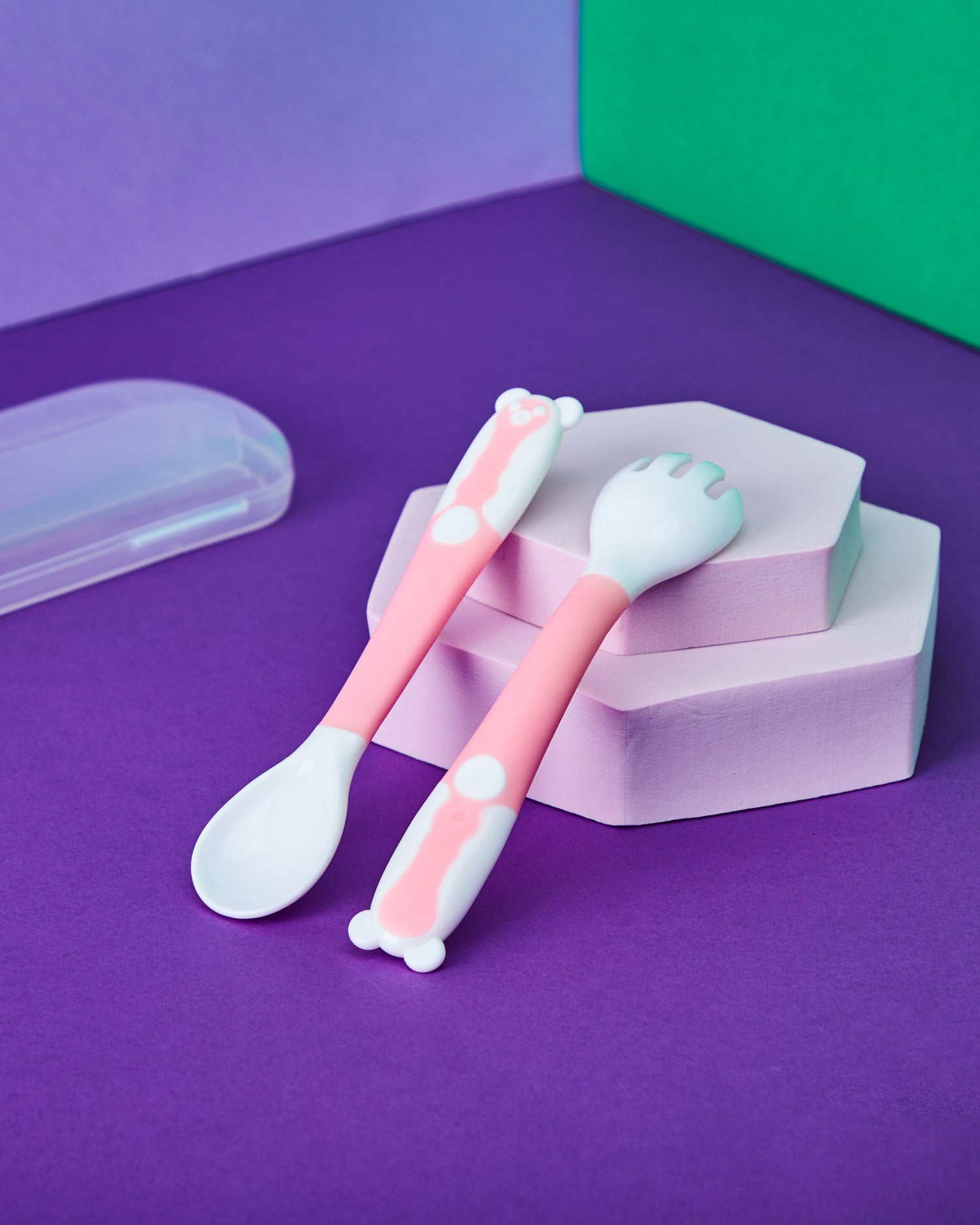 Lindo set de cubiertos plástico para bebés y niños. Incluye una cucharilla y un tenedor. Libre de BPA.