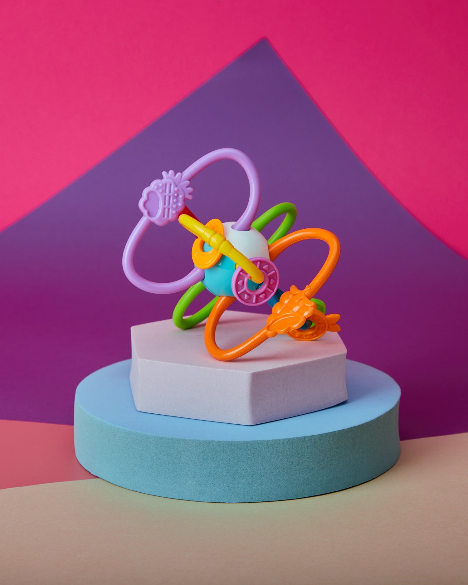 Es un juguete para masticar, perfecto para las manos pequeñas y entrenar el agarre desde temprana edad. Incluye cascabel para estimular reconocimiento del sonido, recomendado desde los 3 meses.