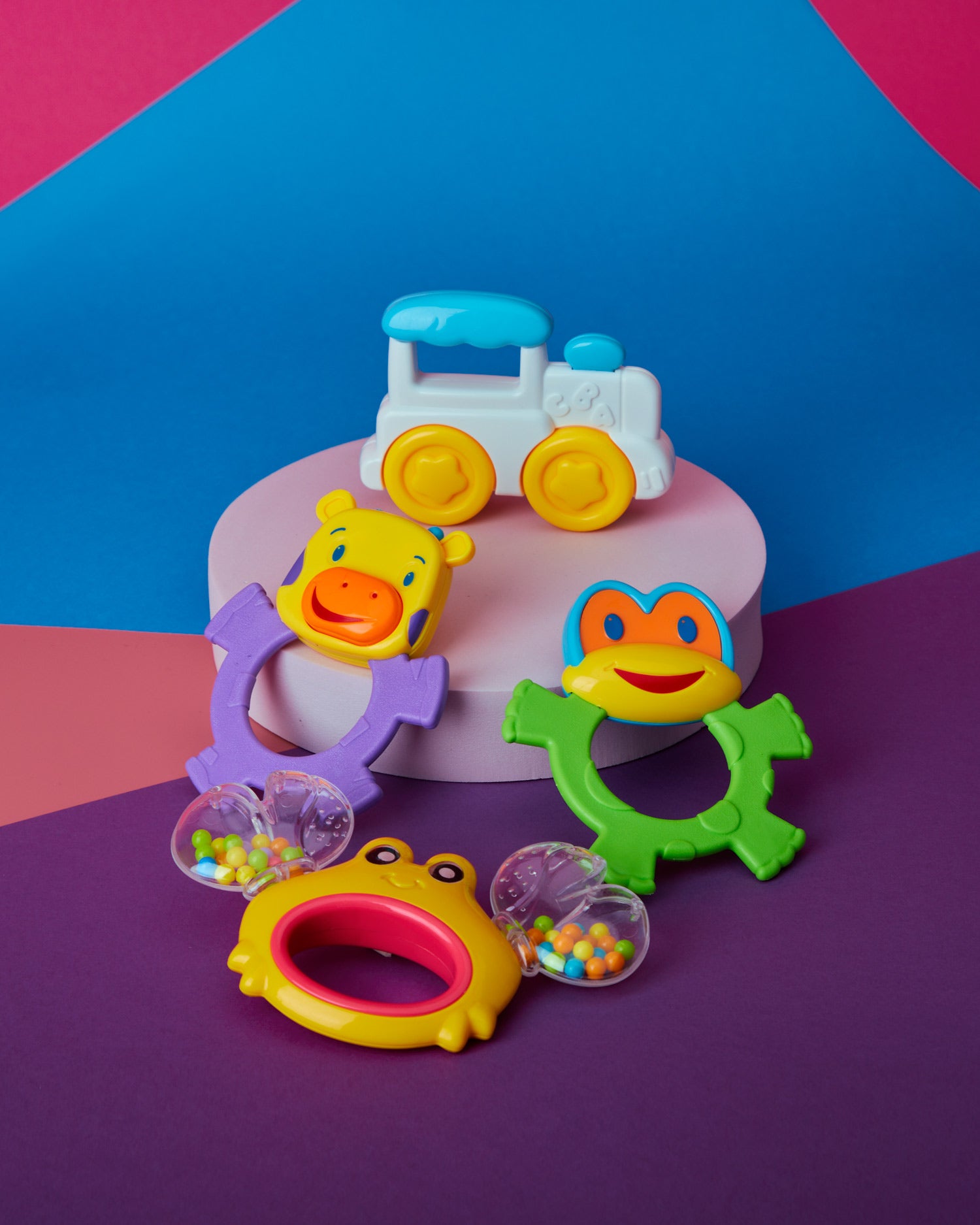 Set de 4 sonajeros que tienen el poder de entretener a tu bebé con sonidos y colores, estimulando todos sus sentidos y la coordinación.