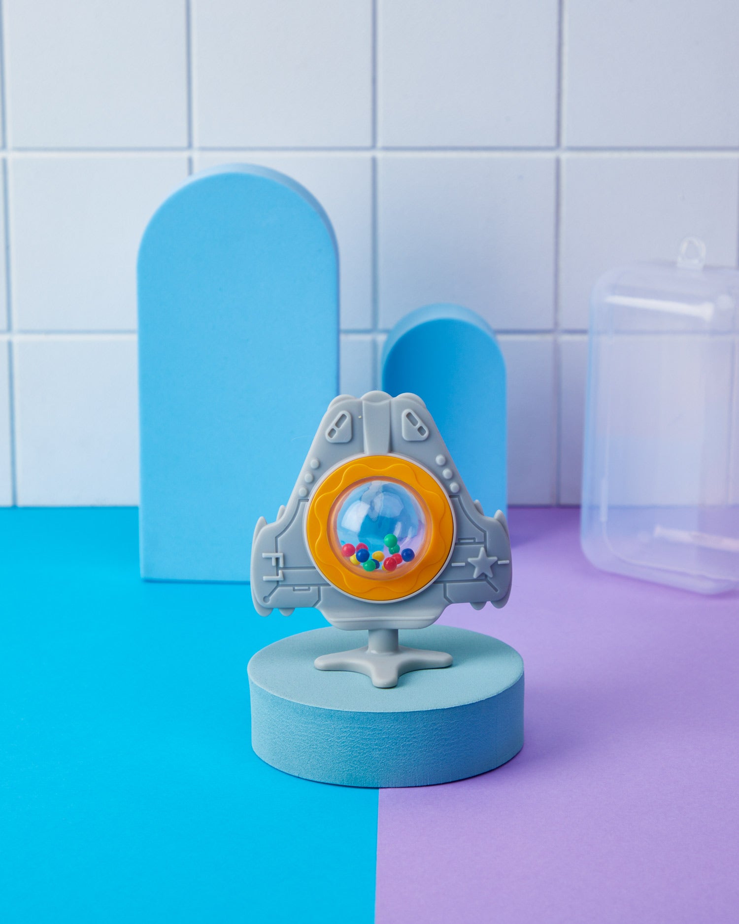Mordedor con forma divertida de nave hecho de silicona. Incluye sonajero de cascabeles en su interior.