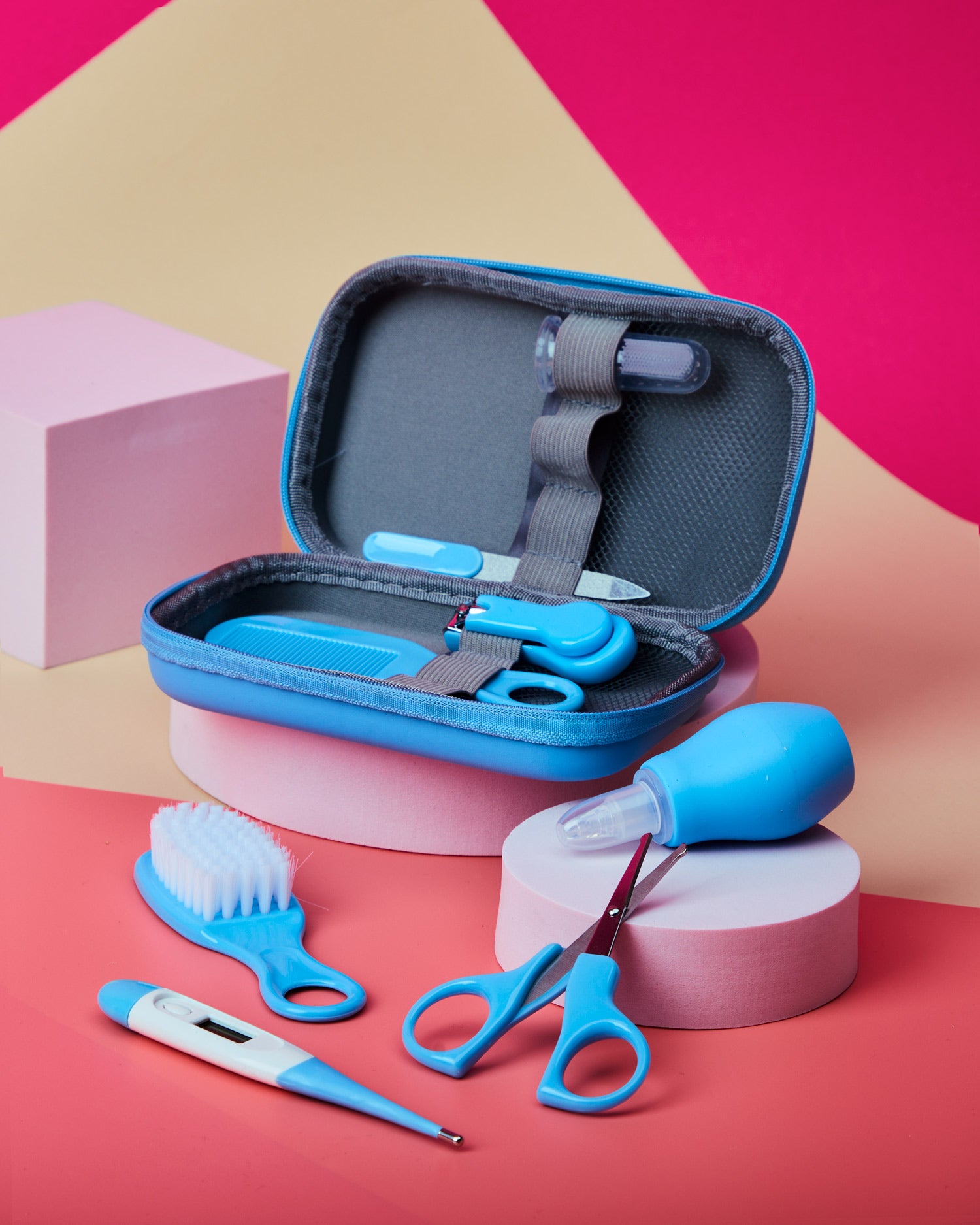 Viene con cepillo , peine para el cabello, cortauñas, lima de uñas, tijeras, limpiador de nariz, termómetro y cepillo de dientes con dedal.