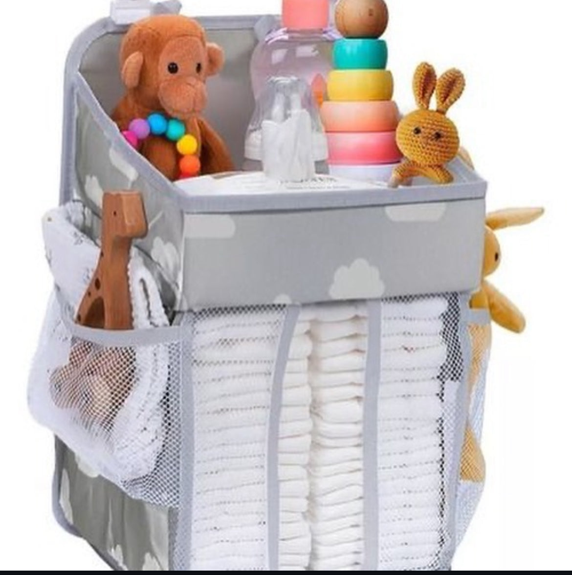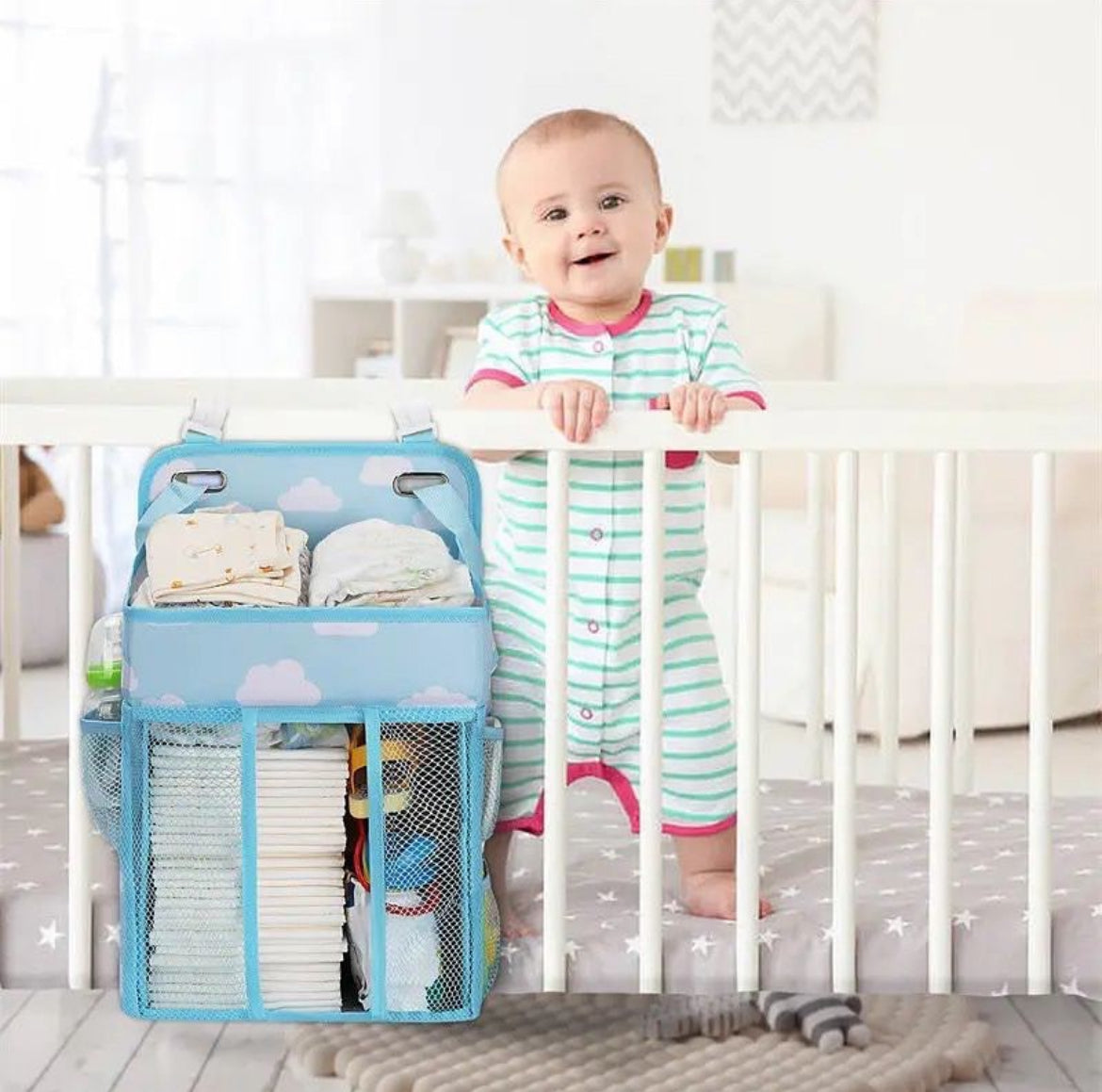 Este increíble organizador de cuna te ayuda a organizar todo lo que necesitas a mano para tu bebé, pañales, toallitas húmedas, lociones, colonia etc.