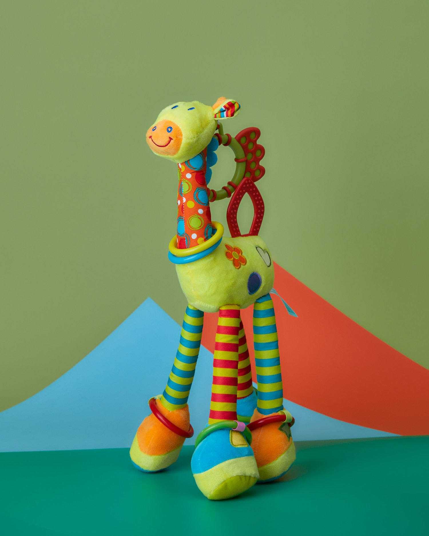 Argollas en cuello y patas, para aumentar la curiosidad, posee un cascabel en su interior y un material libre de BPA en su cola para ayudar en el proceso de dentición del bebé.