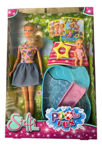 Fabuloso set de Steffi en la Piscina que incluye un pequeño bebe con el cual se podrán compartir aventuras inolvidables.